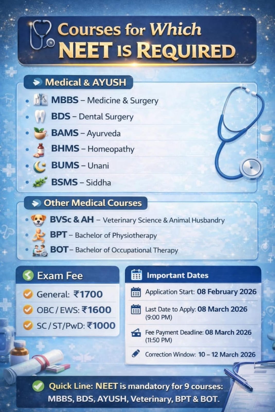 If you are planning to build a career in the medical field, NEET 2026 is your gateway. The National Eligibility cum Entrance Test (NEET) is mandatory for admission to several medical and allied health science courses in India. ? Courses for Which NEET is Required ? Medical & AYUSH Courses MBBS – Bachelor of Medicine & Bachelor of Surgery BDS – Bachelor of Dental Surgery BAMS – Bachelor of Ayurvedic Medicine & Surgery BHMS – Bachelor of Homeopathic Medicine & Surgery BUMS – Bachelor of Unani Medicine & Surgery BSMS – Bachelor of Siddha Medicine & Surgery ? Other Medical Courses BVSc & AH – Veterinary Science & Animal Husbandry BPT – Bachelor of Physiotherapy BOT – Bachelor of Occupational Therapy ? Quick Note: NEET is mandatory for these 9 major courses. ? NEET 2026 Exam Fee General Category: ?1700 OBC / EWS: ?1600 SC / ST / PwD: ?1000 ? Important Dates (NEET 2026) Application Start Date: 08 February 2026 Last Date to Apply: 08 March 2026 (9:00 PM) Fee Payment Deadline: 08 March 2026 (11:50 PM) Correction Window: 10 – 12 March 2026 ? Why NEET is Important? NEET is the single national-level entrance exam that ensures transparency and equal opportunity for students seeking admission into medical and AYUSH courses across India. Scoring well in NEET opens doors to government and private colleges. ? Final Words If you dream of becoming a doctor, dentist, physiotherapist, veterinarian, or AYUSH practitioner, start your NEET preparation early. Stay updated with official notifications and don’t miss important deadlines. Your medical career starts with NEET — Prepare Smart, Apply On Time, and Achieve Your Goal!